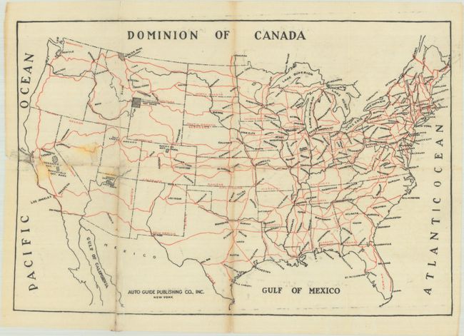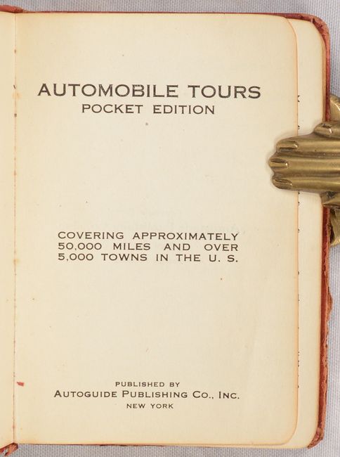 This early automobile guide was issued by the Autoguide Publishing Company in New York.  It features a small folding map of the United States with red lines representing the auto tours described in the text.  There are 146 pages of detailed tours along with a 102-page alphabetical index.  The last section is “Motor Car Troubles and How to Detect Them.” The copyright page indicates “Patent Pending.”  256 pages.  This high-quality publication includes a full leather binding with gilt decorative elements on the front cover.  Also in gilt, text on spine reads “Edition de Lux Automobile Tours."  OCLC lists the book but locates no institutional holdings or other publications by the company. The only copyright record for the publisher is this volume.