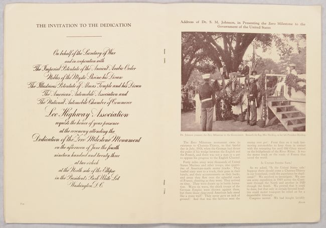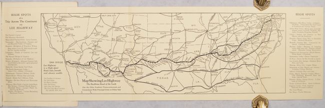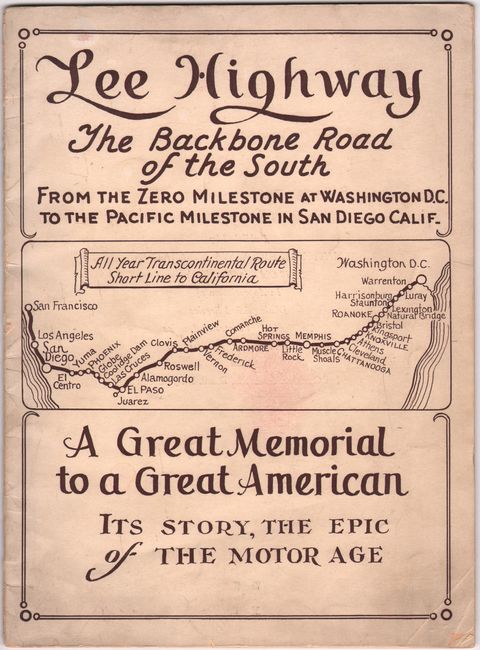 This promotional brochure for the Lee Highway (Route 11) was published by the National Highways Association.  The 23-page booklet includes a number of photographic illustrations along with two folding maps attached to the rear cover: Map Showing Lee Highway The Backbone Road of the South (25 x 7.8") and Map Showing 1st Section of Lee Boulevard…from Arlington Memorial Bridge to Falls Church Va (19.3 x 8.0"), which features an illustration of the Arlington Memorial Bridge “To be opened by November 1931.”  Extending from Washington, D.C. to San Diego, the Lee Highway was conceived as a southern transcontinental alternative to the Lincoln Highway to the north.  It was announced with great fanfare at the White House with the placement of the Zero Milestone on the White House lawn.  The route still exists but the use of the Lee Highway name is rarely in use.  The most noteworthy exception for now is Lee Highway in northern Virginia where the legislature has passed a bill to allow the counties to rename it.  Paper wrappers feature a small map of the “All Year Transcontinental Route Short Line to California” on the front cover and a photo of the Zero Milestone at the White House on the rear cover.  We found only one institutional example listed on OCLC.