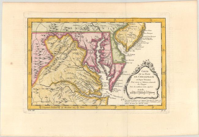 This finely engraved colonial map covers most of Virginia, Maryland, and Delaware, with a bit of Pennsylvania and New Jersey as well. The interior is fully engraved with mountains and great detail along the rivers. An early network of trails and wagon roads are delineated, plus watershed and some topographical information. It extends west to beyond Fort Cumberland and locates Annapolis, Fredericksburg, Williamsburg, Norfolk, and Philadelphia. The delicate rococo-style title cartouche incorporates the distance scale.