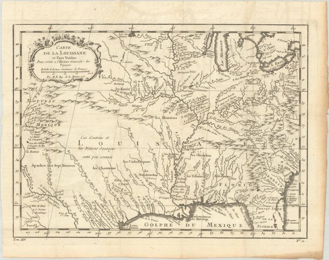 This finely engraved French and Indian War period map of French Louisiana is based on a map by Delisle. It extends from the Great Lakes to the Gulf of Mexico and from Nouveau Mexique to Florida (not showing the tip of Florida). The Mississippi River flows dramatically down the center of the map with tributaries including the Ohio River (l'Oyo ou la Belle Riviere), Missouri River, and the Riviere de Moingona in the area of modern-day Des Moines. The map is filled with place names including many Indian tribes, missions, forts, and early settlements. Nouveau Mexique in the far west includes Santa Fe and names the S. Jerome de Taos. Adorned with a rococo-style title cartouche including a distance scale.