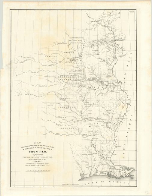 This map was issued as part of the continuing debate over the nature of the frontier defenses between the Mississippi River and the Rocky Mountains in the Secretary of War J.R. Poinsett's report of 1837. It illustrates the proximity of the hostile Indian threat that existed in the 1830s and shows the location of Army posts that were expected to respond to any hostile action. The military troops at these individual posts were inadequate to counter significant Indian opposition making it necessary for speedy reinforcement. The map includes the states of Missouri, Arkansas and Louisiana and the Indian nations bordering them to the west. Locates many military forts and outposts from Ft. Jessup to Ft. Snelling with notations throughout concerning the regions ceded by several Indian nations with the dates of the treaties. Originally published in conjunction with a similar proposal by Charles Gratiot.