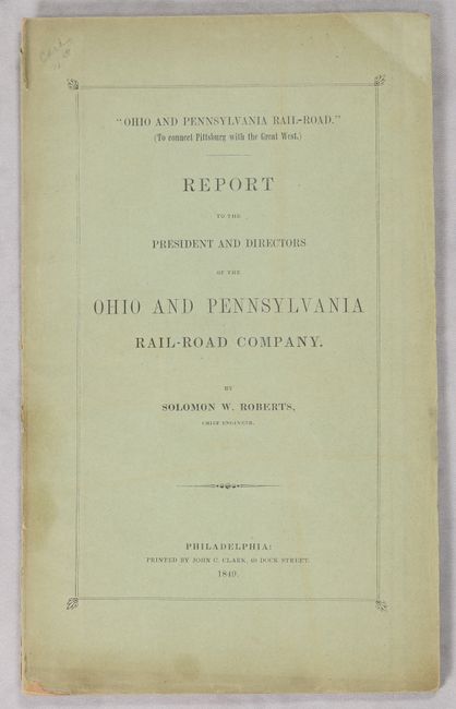 This is the first report for the Ohio & Pennsylvania Railroad, made by its chief engineer Solomon Roberts. The company's charter was to extend the Pennsylvania Railroad beyond Pittsburgh in order to connect with other major railroads and canals in Ohio and points west. The frontispiece to the 24-page report is a folding map showing the proposed 101-mile track from Pittsburg to Massillon. The map extends as far as Chicago, and delineates the lines of the Chicago Railroad, St. Louis Railroad, Columbus & Cleveland Railroad, Ohio Canal, and others. The Ohio & Pennsylvania Railroad operated until 1856 when it was consolidated with the Ohio & Indiana Railroad and the Fort Wayne & Chicago Railroad, together forming the Pittsburgh, Fort Wayne & Chicago Railway. Paper wrappers.
