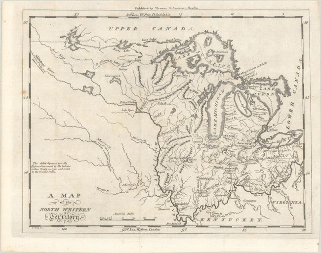This early and fascinating map primarily describes the area between the Ohio and Mississippi rivers, detailing watersheds and many forts. Indian lands ceded to the United States as part of the Treaty of 1795 are identified in Ohio. A huge area referred to as Extensive High Plain[s] appears in northern Michigan. The fictitious Bellin-Charlevoix islands are shown in Lake Superior, the Indian Line is delineated, and the Ohio Company, Connecticut, and Virginia Lands are identified. The Mississippi River is labeled Source Unknown. The Missouri River is "Said to be navigable 1300 Miles." Frontier villages include St. Louis, Tawas, and Kaskaskias. A copper mine is noted in today's Upper Peninsula. Only four of the Great Lakes are shown with Ontario off the map. On the southwest shore of Illinois Lake is Old Priorias F & V. Chickago appears on Lake Michigan. An early map that was published in Boston by Thomas & Andrews. Engraved by Samuel Hill.