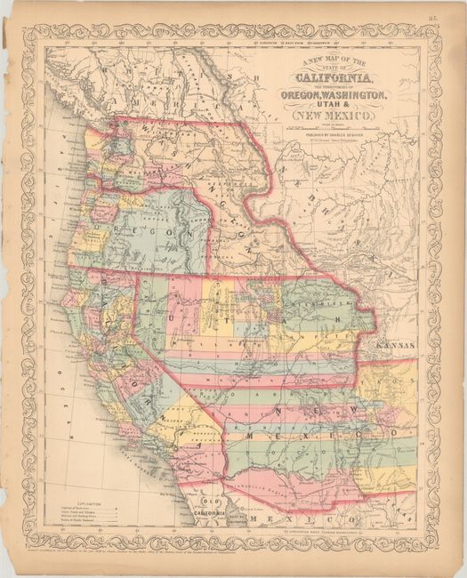 This is the uncommon Desilver issue of this fine map of California with large western territories from an important series of maps originating with Samuel Augustus Mitchell. The map is filled with early county configurations, the exploration routes of Lewis and Clark, Fremont, Kearney, and Cooke, and the Spanish and Oregon Trails. Of importance is the delineation of the newly discovered gold fields in western Kansas (Colorado) with Gold Region printed along the Front Range from the South Platte River to the Arkansas River. In Washington Territory county development is mostly confined west of the Cascades. The state of Oregon had just formed, leaving its eastern half to Washington Territory, which is now shaped as an upside down "L", touching Utah in the south and with its eastern boundary defined by the Continental Divide. Utah Territory extends to Middle Park and Long's Peak in present-day Colorado with its eastern border against Nebraska and Kansas. The three vertical counties of Carson, Humboldt and St. Mary's form the beginnings of what will become Nevada. There is no sight of the future Territory of Arizona, but the region obtained in the Gadsden Purchase is labeled as "Uninhabited Region." Surrounded by Desilver's unique scroll border, with his imprint at No. 714 Chestnut Street, Philadelphia.