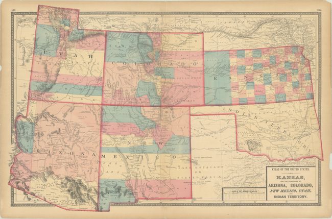 An uncommon, striking, double-page map of the American Southwest. Arizona depicts only 5 counties with a huge Yavapai County occupying the majority of the territory. In Colorado, the Gold Region along the Front Range is prominently depicted. Western Kansas is dominated by Shyenne County, and the Staked Plain is prominently shown in western Texas. The map is filled with roads, railroads, Indian tribes, as well as the U.S. Mail Route, Santa Fe Road, and Santa Fe and Fort Smith Road.