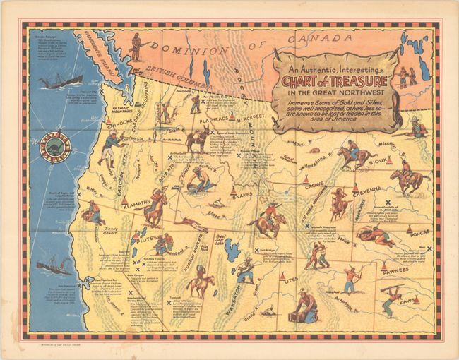 This interesting and unusual treasure map extends from the Great Plains to the Pacific Ocean. It contains text describing various hidden treasures where numerous X's mark the spot. A few of the treasures featured on this map include the steamer Rio de Janeiro that sank off the coast near San Francisco with $2 million in silver, gold discovered in prairie dog holes near Fort Bridger, and large quantities of gold hidden away in the Seminole Mountains of Wyoming by prospectors. Copious illustrations supplement the text including images of sinking ships, prospectors, Native Americans, compass rose, and title cartouche on cowhide. Issued “Compliments of your Sinclair Dealer” (Sinclair Oil Corporation) at lower left. We found only one past sales record for this map.