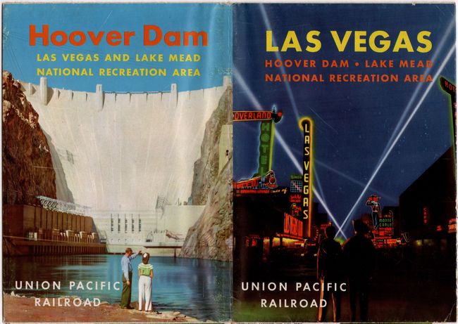 This vibrant bird's-eye view covers the region serviced by the Union Pacific Railroad from Salt Lake City (shown with the Mormon Temple on the distant horizon) down to Boulder City. It is an updated edition of the classic Gerald Eddy pictorial map first published in 1931. It features a great depiction of Hoover Dam, Black Canyon, and Lake Mead. The map also includes the Grand Canyon, the national parks of Bryce and Zion, Cedar Breaks National Monument, and more. The route of Union Pacific Tours is shown along the north rim of the Grand Canyon where the Union Pacific Grand Canyon Lodge is prominently located. Since the map's initial publication, Las Vegas has grown significantly from a small town to a thriving resort city. Major roads are named as are many casinos along the strip including the Stardust, New Frontier, Dunes, Sands, Flamingo, the Sahara, and the Fremont Hotel in downtown. Nellis Air Force is shown north of the city. The verso is filled with colorful photographs and a very early depiction of the famous welcoming Cowboy that came to symbolize the marketing and promotion of Las Vegas. Folds into covers with photograph of downtown on Fremont Street showing the Las Vegas, Overland, and Fremont hotels, the Monte Carlo and Hotel Sal Sagev.