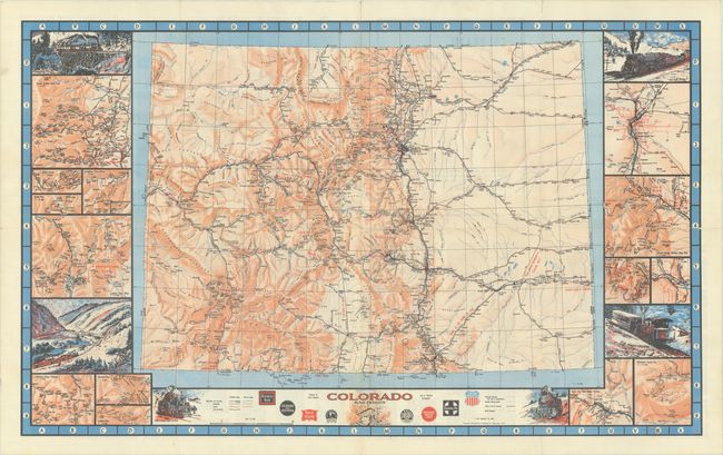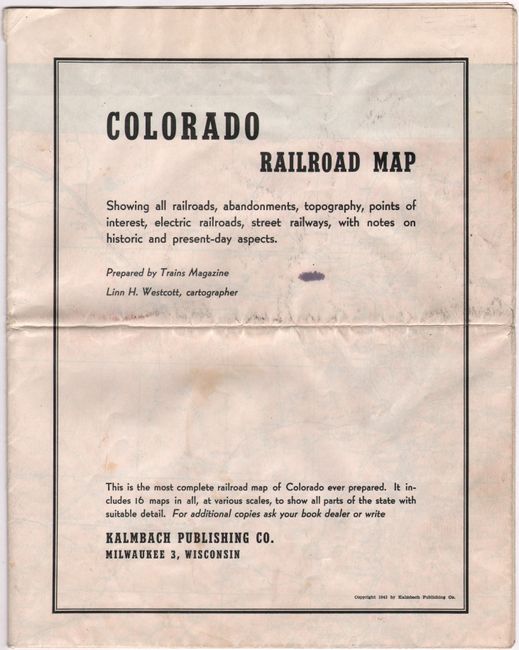 This highly detailed map of the state was drawn by Linn Westcott for Trains Magazine which began publishing in 1940. It presents a remarkable view of the railroad network in the state, with a legend at bottom identifying railroads in operation, abandoned, and projected as well as railroad type including electric, rack and pinion, and narrow gauge. Notations on the map include "first railroad abandoned in Colorado, 1877," "53 miles, no curves," and "lowest point in Colorado." The map also presents an excellent view of the river systems and mountainous terrain through orange shading. Surrounding the main map are vignette illustrations of various locomotives and smaller regional maps. Extensive index on verso. Issued by Kalmbach Publishing, who state that "this is the most complete railroad map of Colorado ever prepared." Train Magazine is still in operation today.