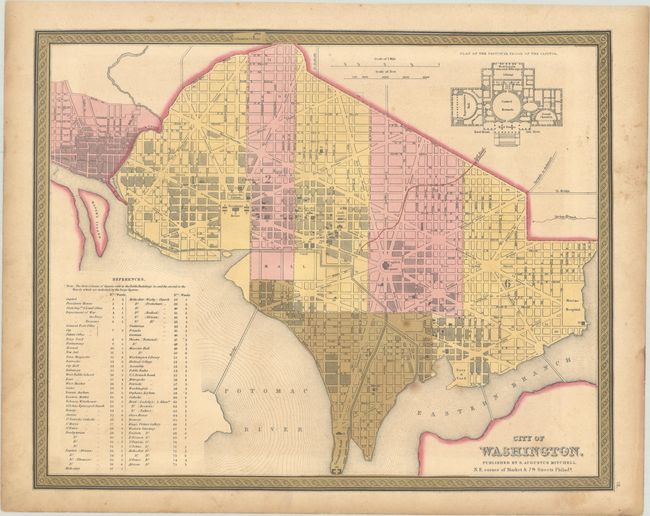 This finely engraved plan of the Capital names all major streets and buildings; notably, the President's House, Capitol Square, the Navy Yard, Judiciary Square and the Patent Office & National Institute. The Mall is mostly blank as construction on the Washington Monument will not start for two years. Also the Smithsonian Institute is not yet mentioned. Extensive table at lower left lists and keys to map 108 important buildings, e.g. the Capitol, State Department, Departments of War, Navy, and Treasury. Decorative scroll-style border. Engraved vignette depicts "Plan of the Principal Floor of the Capitol Building." This map has the Cowperthwaite & Thomas green border with page "16" at lower right outside the neatline.