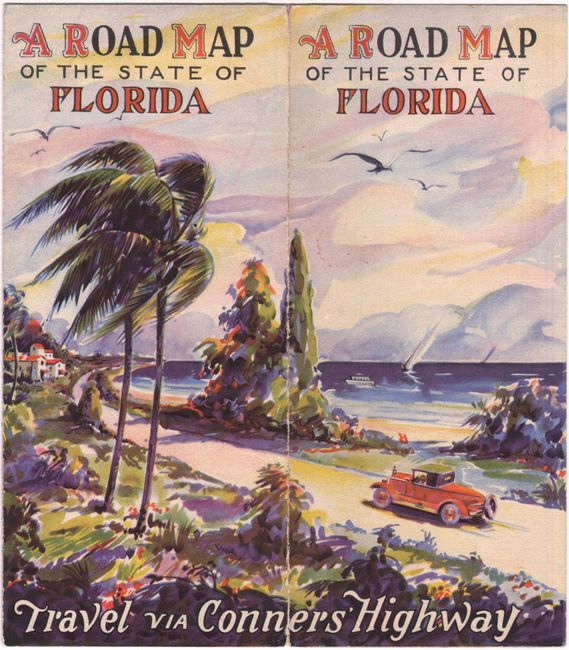 This highway map of the state was issued by The Samuel Frommer Company in Indianapolis. A legend at upper right identifies four different road types on the map including hard surfaced, semi-hard surfaced, graded and unimproved. Of particular interest is the depiction of Conners Highway on the east side of Lake Okeechobee. The highway was the creation of Buffalo businessman Willliam J. Conners, who built the 52-mile private toll road through the Everglades from near West Palm Beach to Okeechobee City. The highway was a significant engineering achievement and contributed to the development of south and central Florida. However, the tolls were expensive, and the state purchased the road in 1930 after Connors’ death. On the verso are illustrations of various attractions in the state and text promoting Conners highway and his holdings in Okeechobee City, which was “destined to become the Chicago of Southern Florida.” Self-folding with an attractive illustration of a car driving on the new highway.