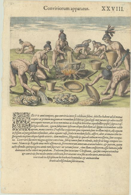 This striking engraving is Plate XXVIII from Part II of de Bry's Grands Voyages, which details the French adventures in Florida between 1562-65.  It depicts the Indigenous peoples of Florida as they prepare for a feast during the season of celebration.  The text states that Christians could learn from the moderation of the Indigenous people, who can live to be older than 300 years old thanks to their self-control.  From the first Latin edition, published in 1591.  On a sheet of Latin text measuring 8.8 x 13.0".
