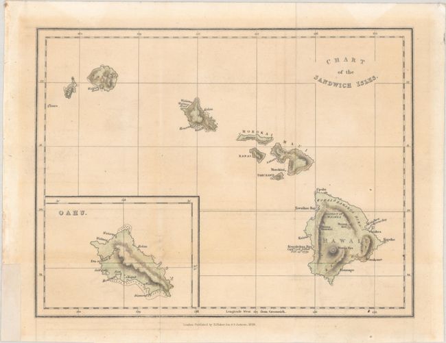 This small map served as the frontispiece to the fourth edition of William Ellis' Narrative of a Tour Through Hawaii. It names each of the Hawaiian islands, as well as several towns, bays and mountains. Topography is rendered with hachuring, and there is an inset of Oahu at lower left. A note regarding the death of Capt. Cook appears in Kearakekua Bay, on the southwestern side of the island of Hawaii. The maps in Ellis' work are notable as the first to portray volcanic activity in Hawaii.