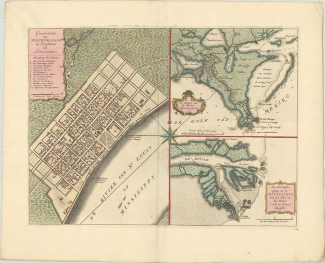 This handsome sheet consists of three maps composed around a large compass rose. It is Tirion's version of the map first drawn by De la Tour in 1720, only two years after the founding of New Orleans. The first map is a plan of the city of New Orleans (now the French Quarter) vividly depicting its protective canal, barracks, and quays. The second is a map of the vicinity of New Orleans including the delta and surrounding bayou. The third is a map of the location of Fort la Balisle at the mouth of the river, which sank into the marsh in the late 1700's. Each map has a delicately engraved title cartouche, and a lovely compass rose connects all three maps.