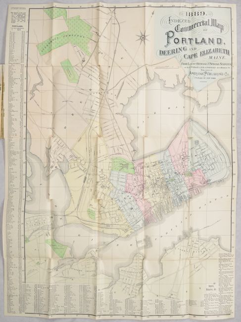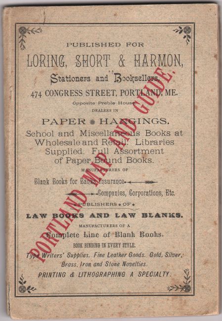 This detailed street plan of Portland, Maine and its surroundings was derived from the surveys E.C. Jordan, Civil Engineer. It was published soon after the Union Station opened in 1888; the historic station, which was torn down in 1961, is located on the map near St. John Street. The map spans from Evergreen Cemetery south to Cape Elizabeth and features excellent detail of streets, parks, cemeteries, wharves, and more. Railroads shown include the Boston and Maine, the Maine Central, the Grand Trunk, and the Portland and Rochester. A street index wraps around the map. The map appears in the back of a 78-page booklet, Indexed Commercial Map and Guide of Portland, ME., published by the American Publishing Company for Loring, Short & Harmon, Stationers and Booksellers.