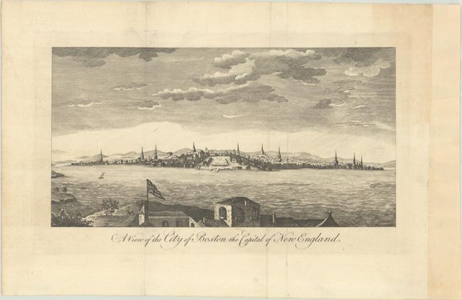 This little view of Boston is a reduced version of one of the most important and rare views of Colonial Boston. In 1768 the leading print dealers of London jointly published a set of American views in the Scenographia Americana. The views were made from drawings that were drawn on the spot, often by military artists. Six of the views were from sketches made by Thomas Pownall - including this one. Thomas Pownall, governor of Massachusetts during the French and Indian War (1757-59), was one of the few sympathetic colonial governors in the British Colonies. He was also an artist, author and mapmaker. This version, engraver unknown, appeared in the Universal Magazine. There was also a later version published in the mid-nineteenth century. This view is not found in Jolly's Maps in British Periodicals,> as volume 56 is missing from the collation.