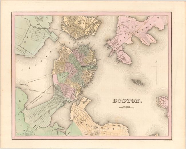 A handsome and detailed plan of the city prior to filling in the Back Bay. Extends to include South Boston, Roxbury, Cambridge, Somerville, Charlestown, and East Boston. Names several bridges and railroads leading into the city. Engraved by G.W. Boynton.