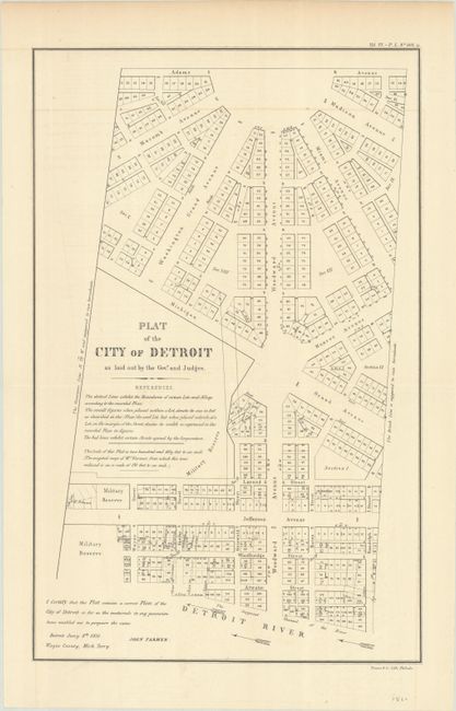 This city plan of Detroit was originally issued in a Congressional document that reviewed public land issues resolved between December 1828 and April 1834. In 1805, the old town of Detroit was destroyed by fire. In 1806, Congress passed a law appropriating 10,000 acres in and adjacent to the old town and authorized the Governor of Michigan Territory to lay out a new town and deal with the land title issues. It took until 1831 for the Governor to officially report back to Congress, as there were a number of former land owners who filed claims for property lost when the town was re-platted. The plan sparked considerable controversy from citizens of Detroit who complained to Congress that they, and not the Territorial Governor, should have the right to plat their own city. Published in the American State Papers circa 1860.