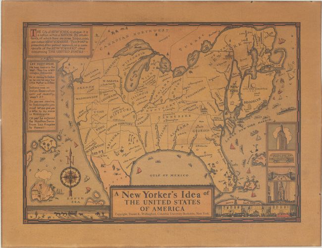 New Yorkers are known to have great pride in their city, and this humorous map perhaps best demonstrates a New Yorker's perspective of the United States, with Manhattan, Long Island, and Staten Island dominating the eastern seaboard. New York is shown as the largest state in the US, with Long Island itself depicted larger than both California and Texas. All of the states are distorted and a number of states and cities are mis-located, as they clearly are not important enough for a New Yorker to know exactly where they are. The state of Pennsylvania is called Philadelphia, with Pennsylvania noted as a city in the northwest of the state. New Orleans is shown in Florida, Louisiana and Mississippi are inverted, and Minneapolis and Indianapolis are noted as "Twin Cities" within Michigan. The text at top left states that the city of New York is "a nation within a nation" with 7 million inhabitants. Several decorative vignettes fill the borders of the map with images of a cityscape, the Empire State Building, and a Fifth Avenue Coach bus to the east, while a stagecoach and donkey cross the desert to the west. Created by Daniel K. Wallingford. There were several different editions of this map, this being a larger version including the World's Fair grounds on Long Island. Blank verso. Published by the Columbia University Bookstore.