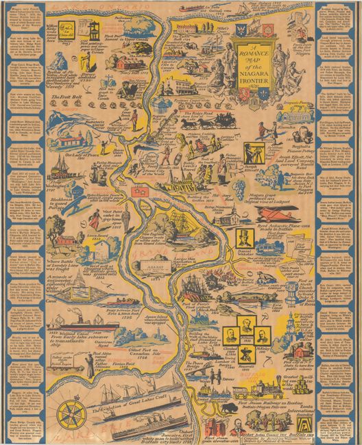 This gorgeous pictorial map covers the Niagara Frontier in between lakes Erie and Ontario. Compiled by Josephine Wilhelm Wickser and drawn by Mildred C. Green, it initiated the sequence of 9 "romance maps," many of which were compiled and/or executed by educated women with an interest in American history. The map is dense with charming illustrations emphasizing the historical attractions in the area. Among the images are "the Evolution of Great Lakes Craft;" portraits of Fillmore, Cleveland, McKinley, and Theodore Roosevelt; the burning of Buffalo in 1813; Ararat, City of Refuge on Grand Island; a West Point cadet in Chippewa; Father Hennepin beholding the Niagara Falls; an Iroquois peace house; the "greatest fur trading post in America;" and much more. A decorative title cartouche at top right incorporates a missionary, fur trappers, an Indigenous man, and emblems of the region. Panels of text at left and right provide more facts on the region. Though the imprint has been trimmed away at bottom, this map was published by the Whitney-Graham Company, Inc. in 1931.
