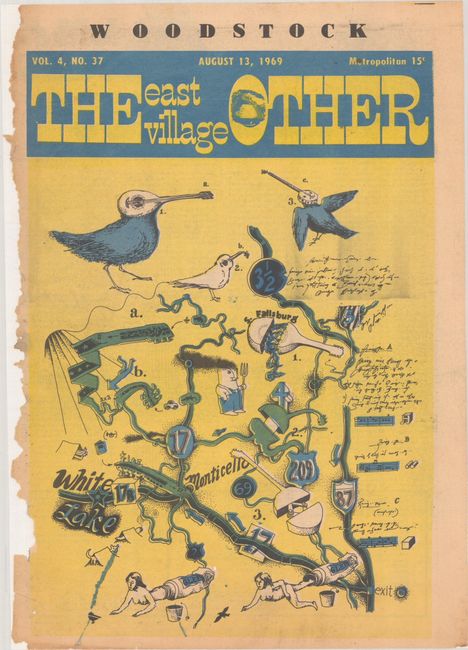 This is the complete, original 20-page issue of the 13 August 1969 edition of The East Village Other, featuring a map and article on the Woodstock Music and Art Fair. The cover art for this issue is a psychedelic map of the area around Bethel, New York, where the music festival took place just a few days later from August 15-17. The map is filled with surrealistic images, including a play on the Woodstock Festival logo of a bird on a guitar (originally created by New York artist Arnold Skolnick), which has morphed into three birds with various types of string instruments for heads, possibly to represent the variety of musicians that would be entertaining during the 3-day festival. Other interesting illustrations include three partially dissected guitars and two naked women emerging from tubes of Glee. This playful map was intended to help guide festival-goers to the site, with arrows directing the way along the major roads, although some roads transform into different parts of guitars.