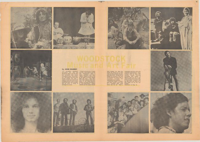 The double-page centerfold features 10 photos of musicians scheduled to perform at the festival as well as an article by John Hilgerdt that continues on pages 14-15. The article gives an overview of the tickets, food ("everything from organic to Mexican"), crafts, security ("356 off-duty NY fuzz"), lodging ("inflatable day-glo vinyl tents"), parking and shuttle bus transportation for the event. Also on page 15 is a quarter-page advertisement for Woodstock with a line-up of the performers for each day. Other items included in this issue are anti-war articles, a comic strip, movie reviews, and bizarre advertisements. There is a later edition dated 20 August 1969 that was intended for a national audience but is otherwise identical to this issue.