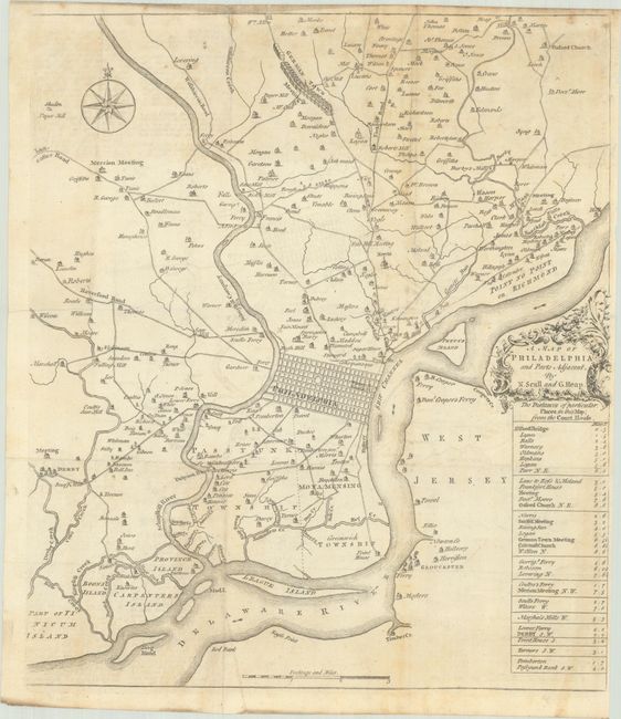 The Gentleman's Magazine published several versions of Scull and Heap's important map of 1750. This Pre-Revolutionary War issue is the less common edition that contains the table of distances below the cartouche, as opposed to the more commonly seen map published in 1777 (#GENT-256). The map holds special value as a historical document because it shows the names of owners of estates and farms outside the city. German Town, for instance, is denoted by a double row of houses. Extends to Oxford Church in the north, the Merrion Meeting (Hall) and Derby in the west, and Boons Island, Gloucester, and the Point House to the south. Decorated by a rococo-style title cartouche and compass rose with fleur-de-lis. Published in the August 1753 issue of the Gentleman's Magazine.