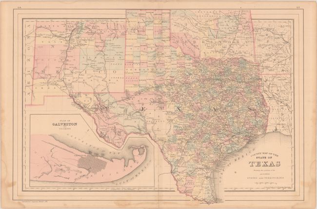 This double-page map of Texas extends to include parts of New Mexico, Oklahoma, Arkansas and Louisiana. The map presents an excellent view of the county development with only the large regions of West Texas yet to be organized. Galveston’s role as a main port of entry is implied by the large inset of the Plan of Galveston and Vicinity. The Llano Estacado or Staked Plain, is shown extending from the New Mexico Territory through the Texas Panhandle. Numerous railroads serve the southeastern part of the state. Indian Territory is divided into several large nations and reservations. Drawn and engraved in Philadelphia by W. H. Gamble.