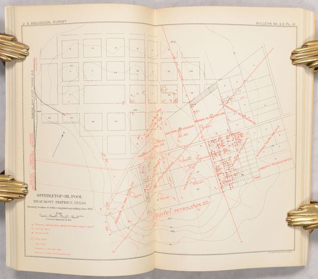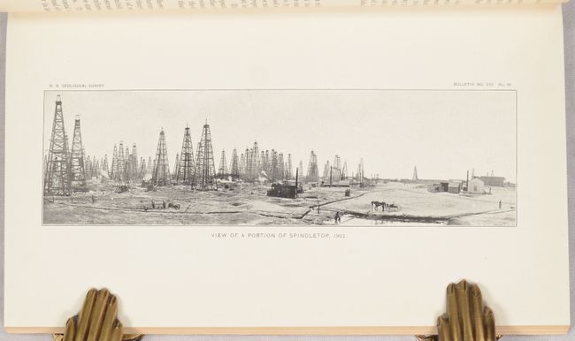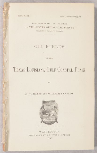 This 174-page report by C.W. Hayes and William Kennedy was published as a result of the discovery of oil at Spindletop, Texas by Captain A.F. Lucas in January 1901.  As a result of this discovery, there was strong demand for geological information of the region, and the USGS determined  "that the interests of the oi-producing industry would be best served by a thorough study of the stratigraphy of the region and the collection of all data regarding the character of the underlying beds."  The report covers the topography and geology of the Gulf Coast Plain, the geology of the various oil pools including Spindletop, and the origins of Gulf Coastal Plain oil.  Illustrations of note include Geological Map of a Portion of the Gulf Coastal Plain (10.7 x 7.9"), Spindletop Oil Pool Beaumont District, Texas..., (10.0 x 7.8"), and “View of a Portion of Spindletop, 1902.”  Paper wrappers.