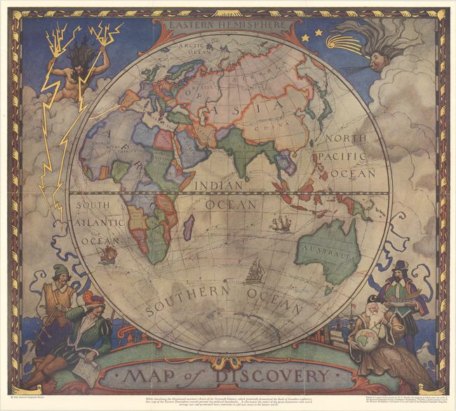 This attractive pair of world maps is based upon murals created by painter N.C. Wyeth which decorated Hubbard Memorial Hall, the National Geographic Society's first formal library. While the maps themselves are based upon modern information and political boundaries, the style and decorative elements are characteristic of 16th century maps including depictions of Zeus, Poseidon, a wind head, and several explorers. The murals also served as the frontispiece to the March, May, July, November and December magazine issues from 1928.
