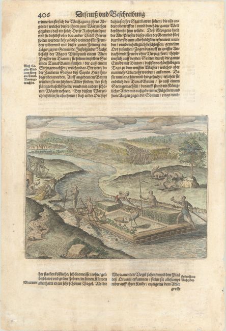 This unusual engraving originally appeared as Plate XII in Part IX of de Bry's Grands Voyages.  The engraving illustrates the mythical origin of Tenochtitlan, which later became Mexico City.  As depicted here, the Aztecs wandered through desolate regions until coming across Tunal, a prickly pear tree with an eagle clutching a smaller bird at top, as prophesied by their god Vitzliputzli.  This area then flourished into Mexico City.  In the foreground is a garden of maize and peas where storks and geese roam; this represents the Aztec's taxes to their chief.  This edition was published in a compendium of De Bry's engravings of the America put out by his heir, Johann Theodore de Bry.  On a sheet of German text measuring 9.3 x 13.6".
