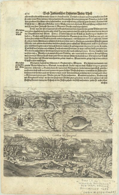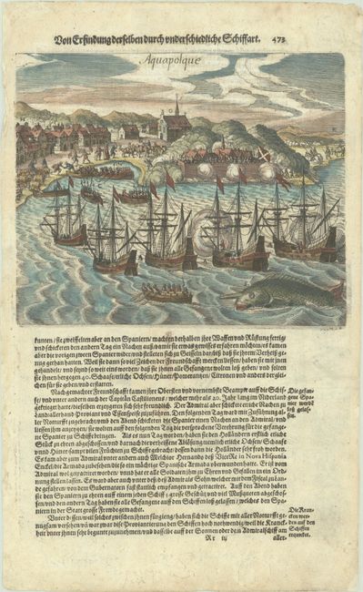 These engravings first appeared in Part XI of de Bry's Grands Voyages in 1620, and were republished in Johann Ludwig Gottfried's Newe Welt und Americanische Historien, a collection of voyages.  The collection was also known as Historia Antipodum. Matthaus Merian, de Bry's son-in-law and publisher for Historia Antipodum, was granted access to de Bry's copper-engraved plates.  On recto is a fine view of Acapulco that depicts Dutch naval officer Joris van Spilbergen's eventful arrival to the city.  Spilbergen arrived with Spanish prisoners that were eventually released in exchange for provisions.  In the background, two small figures can be seen waving white flags and negotiating.  In the foreground is a fantastically large fish that Spilbergen's crew caught.  The verso features three small engravings detailing Spilbergen's adventures in Santiago and Barra de Navidad, Mexico, including a striking battle scene and another illustration of a large exotic fish captured by the crew.