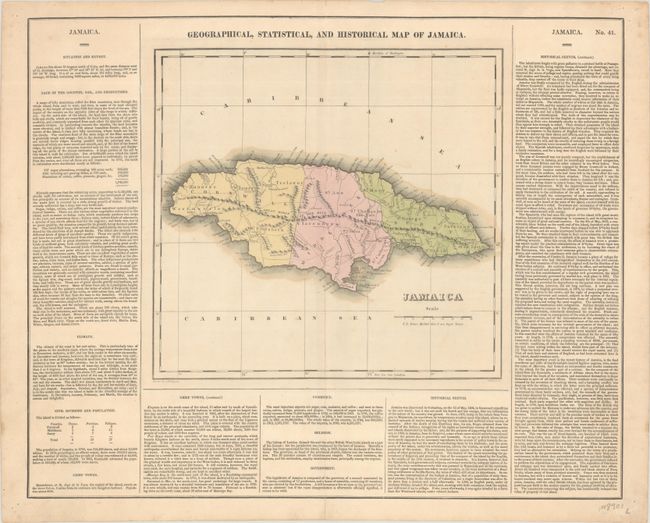This map of Jamaica is divided into the counties of Cornwall, Middlesex, and Surry and depicts the mountainous terrain, coastal towns, and major roads on the island.  The map is surrounded by panels of English text with statistical and historical information on each of the islands.  Drawn by J. Finlayson and engraved by P.E. Hamm.  On a full sheet of English text measuring 22.2 x 17.9".
