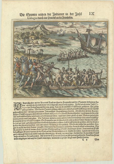 This fascinating engraving is Plate IX from Part V of de Bry's Grands Voyages.  It illustrates an episode between the French and Spanish off the coast of Venezuela at the island of Cubagua.  When the Spanish observed a French privateer poaching in the pearl fisheries they convinced the natives that the French were hostile and that they should prevent them from coming ashore.  The natives drove the French vessel away with poisonous arrows. According to the text, no French ship ever tried to land on Cubagua after this encounter.  Without interference from the French, the Spanish held their monopoly on the pearl banks, allowing them to fish the area until it was depleted.  From the first German edition of Part V, published in 1595.  On a sheet of German text measuring 9.4 x 13.4".