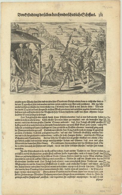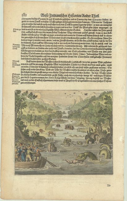This sheet featuring engravings on recto and verso was published in Johann Ludwig Gottfried's Newe Welt und Americanische Historien, a collection of voyages. Also known as Historia Antipodum, Gottfried's work is an abridgement of de Bry's voyages to America that incorporates much new material.  Matthaus Merian, de Bry's son-in-law and publisher for Historia Antipodum, was granted access to de Bry's copper-engraved plates.  The stunning engraving on verso does not appear in de Bry's Grands Voyages; it appears to be engraved from a description of Sir Walter Raleigh's expedition to find El Dorado, as detailed in The Discovery of Guiana (1595).  The engraving shows Raleigh and his crew traveling down the Orinoco, where they witness a man overboard eaten by a lagarto (alligator), here styled as a serpent.  On verso is an engraving that originally appeared as Plate 14 in Part VIII of de Bry's Grands Voyages.  It shows the tree and cliff dwellings of the Indigenous people who live along the Orinoco, as well as the way that the Capuri and Macuri peoples honor their dead leaders by hanging their remains in their homes.  On a sheet of German text measuring 8.8 x 14.1".