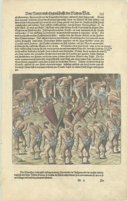 This dramatic engraving originally appeared as Plate 30 in Part III of de Bry's Grands Voyages.  Part III includes Hans Staden's account of his adventures in Brazil between 1546-55.  Staden (ca. 1525 - ca. 1575) was captured by the Tupinamba and held for nine months, allegedly narrowly escaping being killed and eaten.  His account of the tribal customs of the Tupinamba, especially in regard to cannibalism and religious practices, is one of the most vivid and controversial early accounts of the New World.  The engraving here shows the Tupi ritual to contact the spirits.  The plate was republished in Johann Ludwig Gottfried's Newe Welt und Americanische Historien, a collection of voyages.  Also known as Historia Antipodum, Gottfried's work is an abridgement of de Bry's voyages to America that incorporates much new material.  Matthaus Merian, de Bry's son-in-law and publisher for Historia Antipodum, was granted access to de Bry's copper-engraved plates.  On a sheet of German text measuring 9.2 x 14.4".