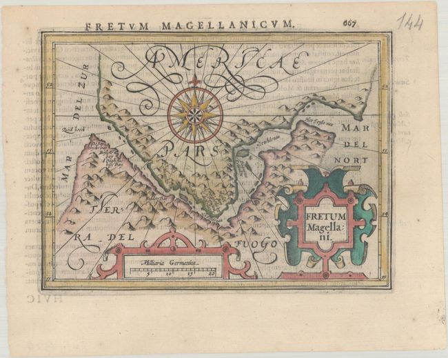 Splendid little map featuring the Strait of Magellan. The map is centered on a large, finely engraved, compass rose and further embellished with strapwork title and distance scale cartouches. Latin text on verso.