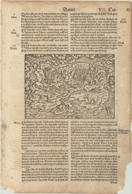 This unusual little map is also known as the Wittenberg world map. It represents Daniel's interpretation of King Nebuchadnezzar's dream. This prophecy from Chapter 7 of the book of Daniel speaks of "the four winds of the heaven … and four great beasts [which] came up from the sea." The barely recognizable continents of the Old World - Europe, Asia and Africa - are depicted with the four beasts of Daniel's dream. The world is surrounded by wind heads in a blustery sky and a stormy ocean. Theologians at Wittenberg interpreted this dream as a foretelling of the victory of the Turks at the Battle of Mohacs in 1526, and the image remained popular for several decades thereafter. The map first appeared in a commentary on the prophet Daniel by Martin Luther in circa 1529, and is often attributed to the printer Hans Lufft. This example is considered the 9th version of the map, which was engraved by Sigmund Feyerabend, whose initials "SHF" appear at the southern tip of Africa. This woodblock version shows changes to the shapes of the continents and a galleon added at bottom right. From a German bible published by George Rab and Feyerabend between 1566-96. On a sheet of German text measuring 8.9 x 13.1".