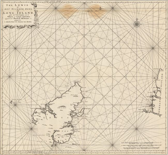 B. The Lewis of het Noorder Deel van Long Island, zynde het Noordelykste van de Western of Lewys Eylanden..., (23.6 x 21.8").  This chart covers the same footprint on a smaller scale, extending to include the western Scotland mainland and the islands of North Rona and Sula Sgeir to the north.  The sheet is filled with rhumb lines and includes three distance scales at bottom right.  Condition:  Issued folding on watermarked paper that has been trimmed to the border all around.  There are two stains and a few small fold separations at top. (B)