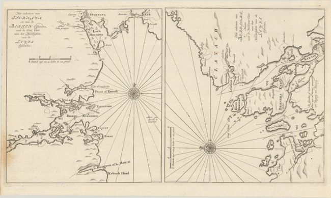 C. Het Inkomen van Stornawa en van de Birken Eylanden, aan de Oost Cust van het Noordlykste van de Lewys Eylanden [on sheet with] Het Inkomen van Burglome..., (19.1 x 10.5").  Two charts on one sheet.  The first extends from Loch Dungeon to Stornoway and Kirk on the northeastern side of the island, while the second details the region around Great Bernera in the northwest.  Condition: There is a small stain along the left border. (B+)