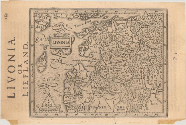 This beautiful miniature map covers present-day Estonia, Latvia, and part of Lithuania. It is fully engraved to illustrate the forests, cities, and villages and is embellished with a strapwork title cartouche and scale of miles. English text on verso, published between 1635-39.