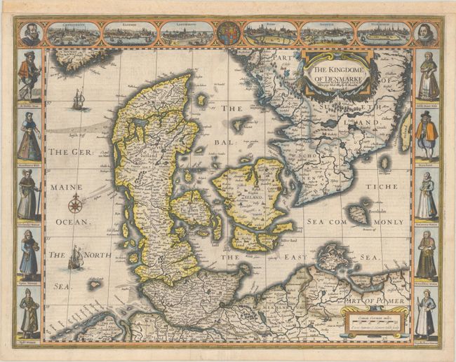 This superb map of the Kingdom of Denmark covers the region that includes Terra Scania on the southern coast of present-day Sweden and Schleswig-Holstein. This is one of only three carte-a-figures map of Denmark. The top panel includes the portraits of King Christian IV and King Frederick III, the royal coat of arms and bird's-eye views of notable places including Copenhagen, Elsinore, Landscroon, Ripe, Schleswig and Hamburg. The side borders illustrate different levels of Danish society with costumed figures. On the verso is English text containing a description of the kingdom. This is an early edition with the imprint of George Humble in Popshead Alley in the cartouche, published between 1627-32. Engraved by Evert van Hamersveldt Symons.