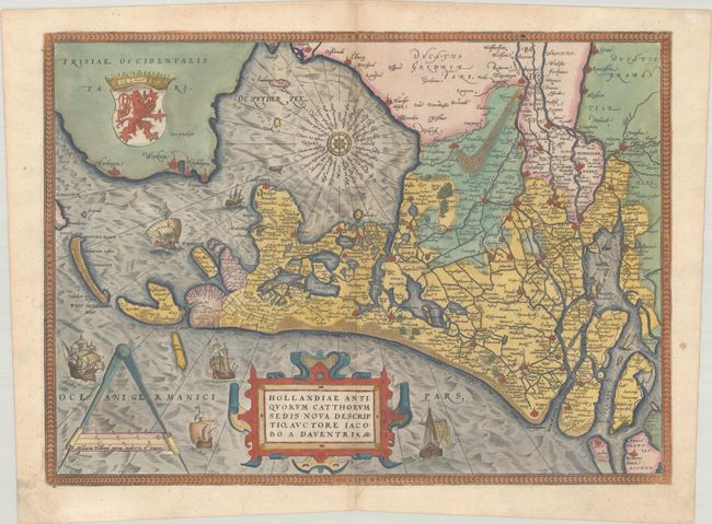 This spectacular map is centered on Amsterdam and shows the region around the Waddenzee. The map is filled with place names and great detail on the fractured land and waterways in this portion of Holland. Decorated with a large strapwork title cartouche, scale of miles with a divider, fancy 16-point compass rose, and the royal coat of arms. The seas are fully engraved and decorated with sailing ships and a small fishing boat. Latin text on verso.