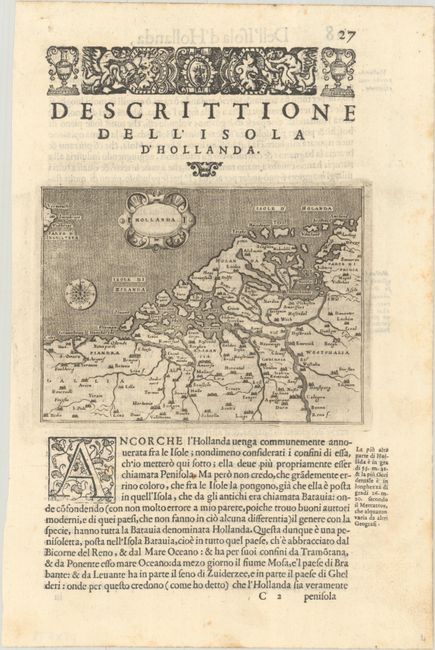 This fine copper-engraved map is in the Italian style with fully stippled seas. Ir depicts the Netherlands with the islands of Zeeland, and part of Flanders to the south. Cities are illustrated with miniature castles and include Rotterdam, Breda, Antwerp, Ghent, and Brussels. Tge map is adorned with a strapwork title cartouche and a compass rose. Engraved by Girolamo Porro and printed on a sheet of Italian text measuring 7.5 x 11.1".