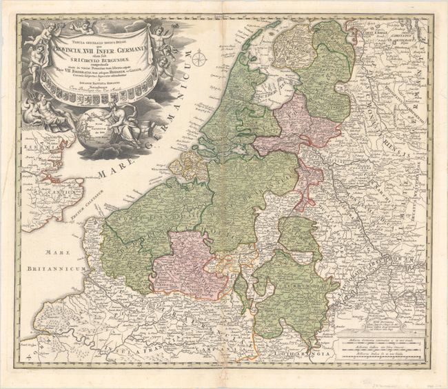 A detailed and decorative map of the Netherlands, Belgium, and Luxembourg with parts of France and the United Kingdom (including London). An elaborate cartouche shows the heraldic shields of the 17 provinces as well as Neptune and Hermes with a globe indicating the Dutch East Indies.