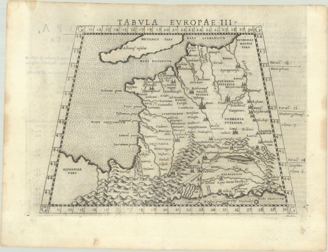 This copper engraved Ptolemaic map of France extends east to include the Rhine and Lacus Lemanus. The Alps and Pyrenees Mountains are clearly shown, and major cities are identified. The sea is stipple engraved in the Italian style. Italian text on verso, published in either 1561 or 1564.