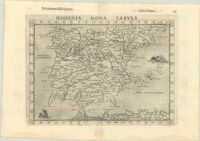 This is a slightly enlarged version of Gastaldi's modern map of the Iberian peninsula. It names several towns and cities, including Madrid, Barcelona, Seville, Valencia, Lisbon, and Porto. The map is engraved in the Italian style with stippled seas, which also include a sailing ship and menacing sea monster. Italian text on verso.