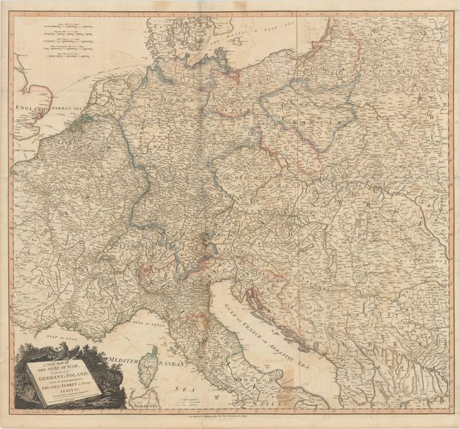 This wall-sized map depicts the theater of war during the Napoleonic Wars and shows most of Europe from France to parts of Eastern Europe and the Balkans. There is emphasis on the boundaries between political entities and the roads that connect cities throughout Europe, with a key distinguishing between roads that are single post, post and a half, and double post in size. Germany and Austria are labeled in bold, decorative letters that stretch across much of central and eastern Europe. As noted in the title, Poland is "dismembered" into Prussia and the Duchy of Warsaw, the latter of which had been established as a French client state by Napoleon Bonaparte in 1807. The decorative title cartouche features the title engraved on a large slab of stone with a crowned German eagle sitting upon it. Printed on two sheets, joined as issued.