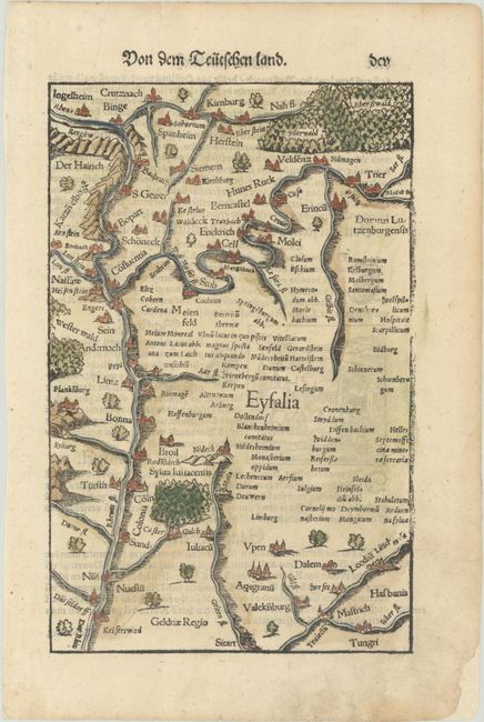 This handsome woodblock map that details the valleys of the Mosel and Rhine rivers in Rhineland-Palatinate and Westphalia. The towns of Bonn, Cologne, Boppard, and many more all have small building icons to indicate size. North is toward the bottom. German text on verso along with a small woodblock city view.