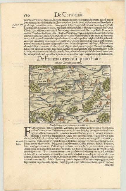 This woodblock map is oriented with north to the bottom of the map, and shows the region between Frankfurt, Fulda and Nuremberg. On a sheet of Latin text measuring 8.0 x 12.3".
