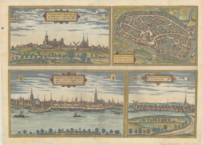 This sheet includes lovely views of Kleve, Emmerich, and Genappe, as well as a bird's-eye plan of Duisburg. The Gothic St. Saviour's church is shown centrally in the plan of Duisburg. The view of Kleve is dominated by the castle of the Counts and Dukes of Kleves (now known as Schwanenburg) and by the church of St. Mary's Assumption. Two large churches rise above the city in the view of Emmerich - St. Martin and St. Aldegund. The last view is of Genappe, Belgium, located south of Brussels. Latin text on verso.
